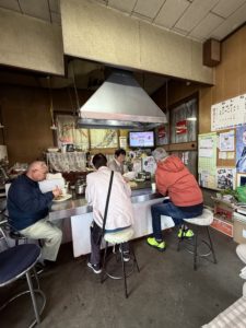 常連さんが3人で食べているのを、後ろから眺めながら待つ。