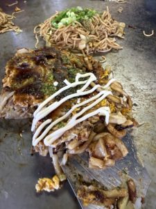 その空気の中で食べたお好み焼きと焼きそばは、