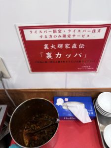 セルフの炊飯器横には、胡瓜とチャーシューを刻んだピリ辛漬物、裏カッパが置かれている。
